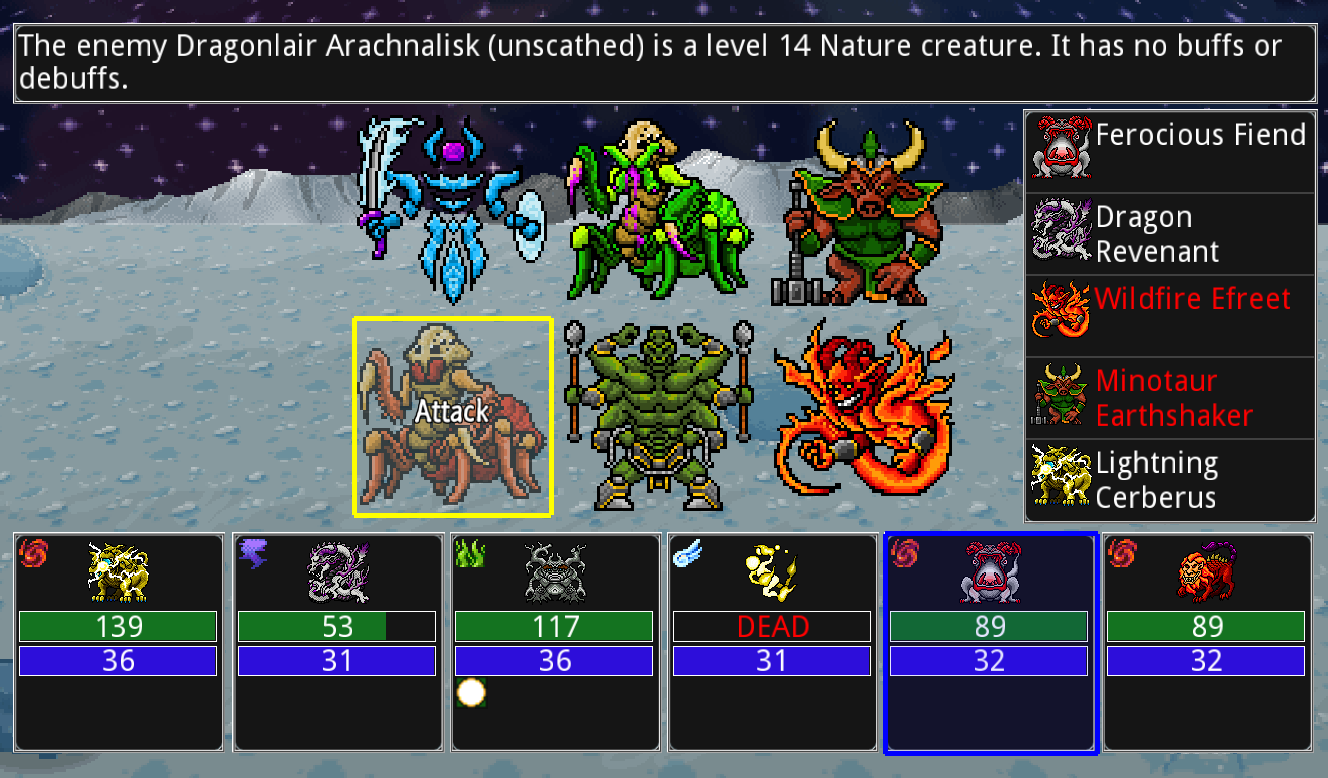 - Equip your creatures with spells. Spells can be found with randomly generated properties that change the way they behave in battle.